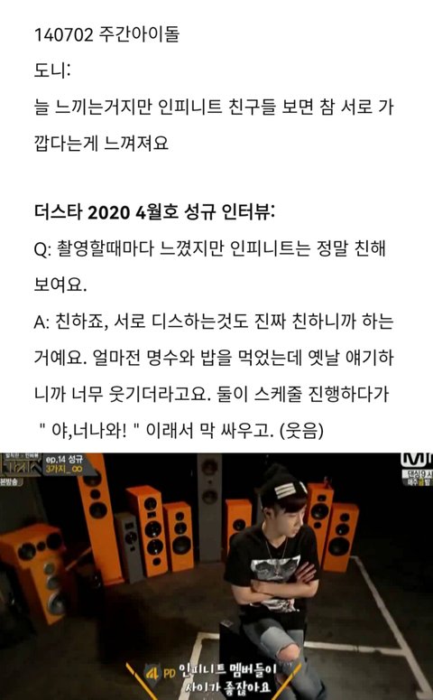 이것만 봐도 사석에서 정말 친구처럼 편한 형이구나 느껴짐. 근데 편한 형이 됐다고 해서 막대할수 있단게 아니라 또 일할때는 성규가 뭐하자고 하면 군소리없이 따르는 멤버들ㅋㅋㅋㅋㅋ 참 성규의 리더십이 존경스러움 ㅋㅋㅋ