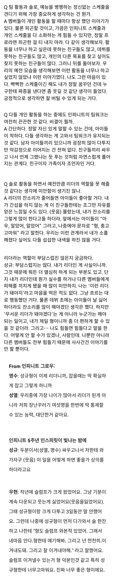 물론 인피니트를 좋아하는데 많은 이유가 있지만 멤버들간의 끈끈한 관계성이나 멤버들이 팀에 대한 애착이 재계약이라는 경험도 하고, 연차가 쌓여 회사가 달라진 지금도 팀의 미래에 대한 걱정보다는 기대와 응원의 마음이 들게 함.