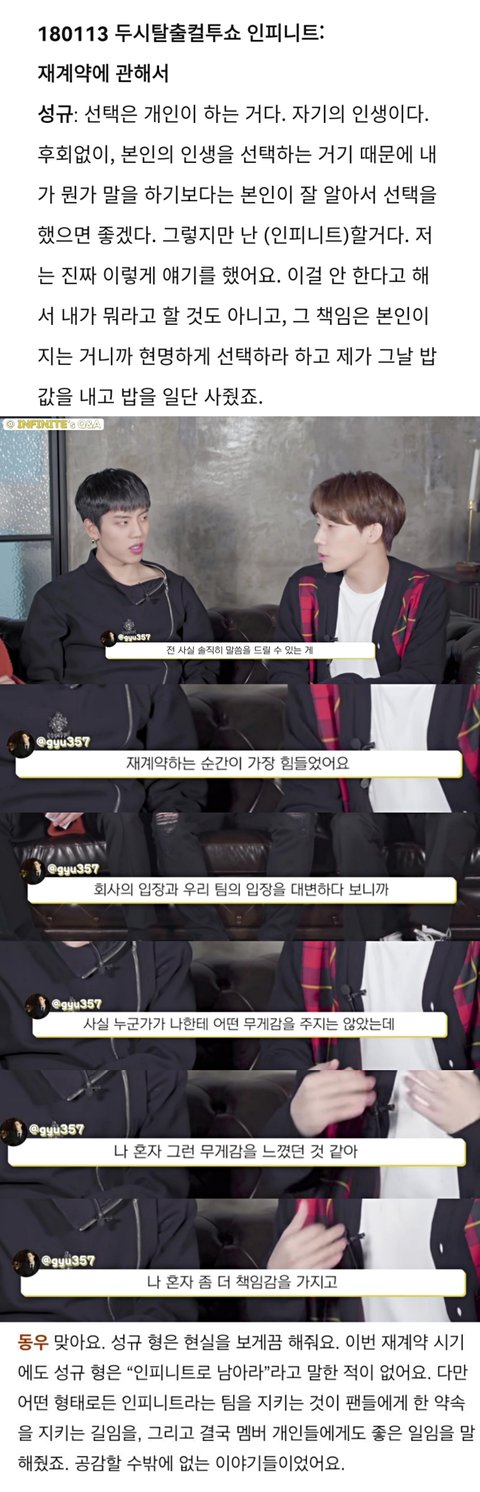 재계약 시기는 본인들에게나 팬들에게나 힘든 시기였는데 유독 성규가 부담감이 많았을거임. 본인들이 알아서 해라고 무심한듯 말했지만 누구보다 팀에 대한 애착이 강하고 본인이 책임지고 가려고하는 성규 성격에 회사와 팀 사이에서 마음고생을 얼마나 했을지... 그렇게 솔직한 성열이가 형 가는데 무조건 따라가겠다고 말했다는데서 평소에 성규가 어떤 리더였는지 잘 알수있지 않을가...