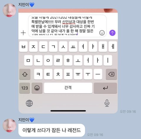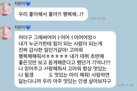 너무 감성적으로 보일지 몰라도 진짜 유지민한테 너무 고마워요 친구가 유지민 버블 해보라고 꼬셔서 한 달만 해봐야징 하고 결제했는데 사진이랑 버블 거의 매일 보내주고 좋은 소식 있거나 가끔가다가 긴 장문으로 보내줄 때 너무 좋았어요 주변에서 사랑한다는 말을 들을 이유도 없고 거의 안 듣는데 맨날 지민이는 사랑행~~ 사랑해애~~ 이러면서 보내줘서 고3 버티고 수능까지 잘 마무리 했어여 뭐 저한테 개인적으로 보낸 것도 아니지만 진짜 힘이 됐던 .. 지금은 117일 됐네요 진짜 진국임 애가 … 제발 카리나 버블 제발 해주세요!!!!!!!!!!!!후회안함!!!!!