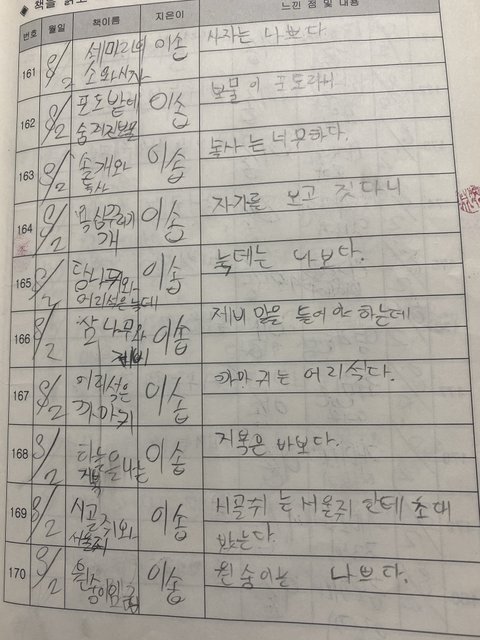 저딴식으로 거의 50개를 써놨음… 진짜 이정도면 이솝의 딸 아님? 돌려막기 씹오짐…… 내용도 조카 직관적임 키다리 아저씨는 키가 크다. 지킬은 하이드다. ㅇㅈㄹ…. 그냥 야오치는 중국인이다. 이런식으로 냅다 써버리면 당장 한줄 독서록 ㅆㄱㄴ 이정도면 진짜 몇 개는 안 읽고 쓴듯;;;;ㅋㅋㅋㅋㅋㅋㅋㅋㅋㅋㅋㅋ 맞춤법도 킹받음..
