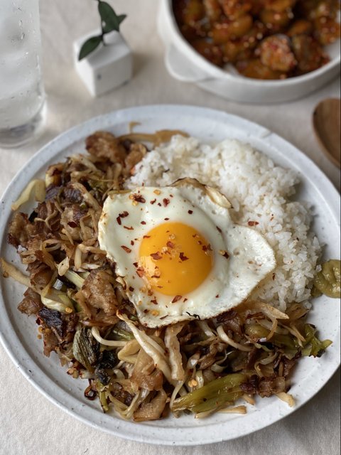 냉털 겸 집에 있는 야채들이랑 차돌박이 넣어서 굴소스에 볶아서 만든 덮밥이에요. 계란 반숙 터트려서 섞어 먹으면 진짜 맛있어요..♥️