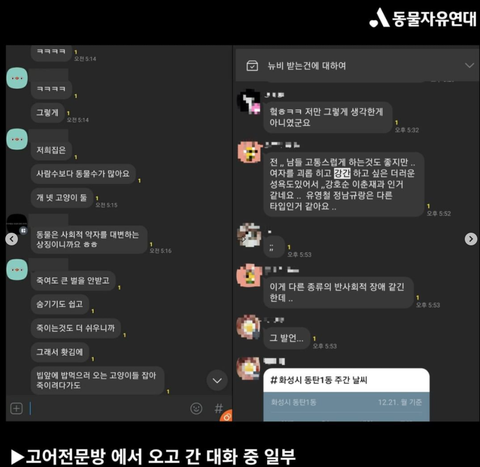 님들 고어전문방이라고 아시나요??  간단히 말하면 카톡 오픈채팅방 에서 싸이코들이 모여서 지들끼리 고양이 머리, 너구리 뼈 발골한거, 토끼 목잘라서 죽이는 영상 이런거 지들끼리 공유하고 좋아하고 이러다가 내부고발자 때문에 알려져서 처벌해달라고 국민청원 20만명 넘게 나오고 한때 되게 시끄러웠음…