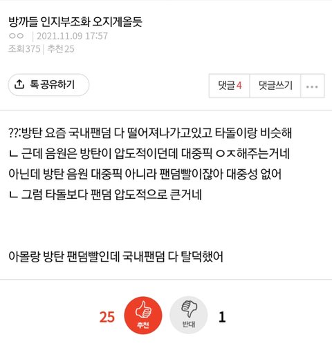 진짜 싫어하는듯 팬덤 압도적인 애들이 그런말까지 듣는게 부러운건가