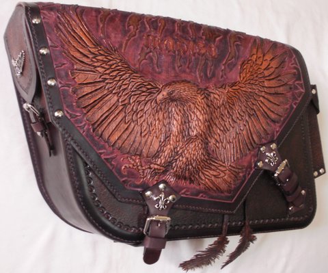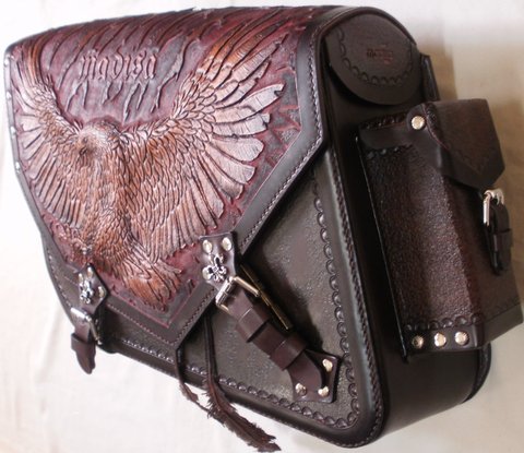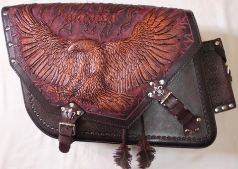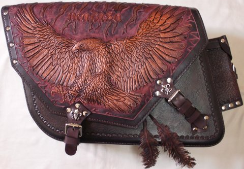가죽에 독수리 디자인을 카빙하고 브라운 톤의 엔틱,천연염색을 하여 수작업으로 제작한 핸드메이드 바이크용 새들백(사이드백)입니다.(마디샤-가죽공예 강좌,주문제작