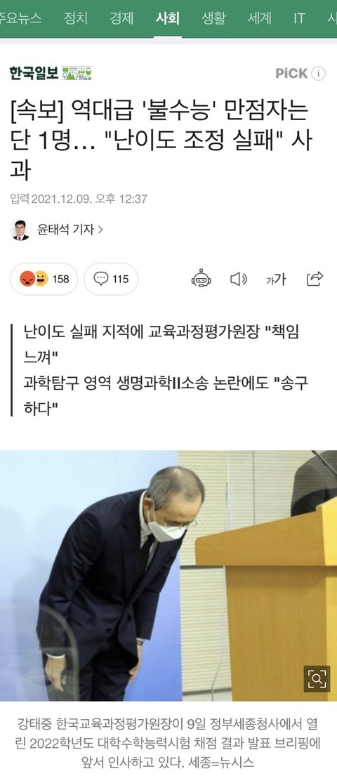 근데 이번 시험이 단순히 어렵게 냈다고 욕 먹을 건 아닌 것 같은데.. 사실 수능은 물보다 불인게 나음. 1명까진 아니어도 수능 만점자 수 적게 나오는 수능이 맞는거임 그 외에 몇십명 씩 나오는 게 오히려 변별력 없는 물수능이고 상위권 애들은 그게 더 싫은 수능임.