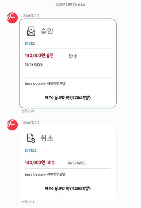 정말 아까 결제가 잘못되었어도 저한테 설명을 하고 진위 확인한 뒤에 결제했어야지 새벽 약 3시 경에 고객한테 설명도 없이 도둑결제를?? 그나마 결제문자가 날아오는 카드이고 제가 새벽에 깨어있으니 망정이지 하마터면 재결제가 된지도 모르고 체크아웃할 뻔 했습니다.