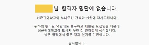 그래도 다른 곳은 걍 합격자 명단에 없습니다 or 지원해주셔서 감사합니다가 끝인데 성대는 멘트가 덜 기분 나쁘더라 그래도 참 좋은 학교라는걸 느낌 떨어진건 속상하지만 그래도 저렇게 말해준건 고마움 사실 떨어진 다른 학교 홧김에 반장난식으로 좀 욕했는데 성대 발표나고 좀 내 자신을 되돌아보는 계기가 됐음...