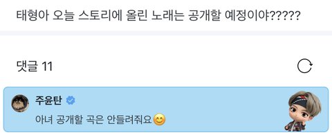 아닛 그냥 내줘ㅠㅠㅠㅜㅜㅠㅠㅠ 사클에ㅠㅠㅜㅜㅜㅜ 아니 나 위버스에서 글 거의 안쓰는데 인스스 보자마자 제발 노래 내달라고 겁나 징징거렸는데 바로 저 댓글 올라옴ㅠㅠㅠㅠㅠ
