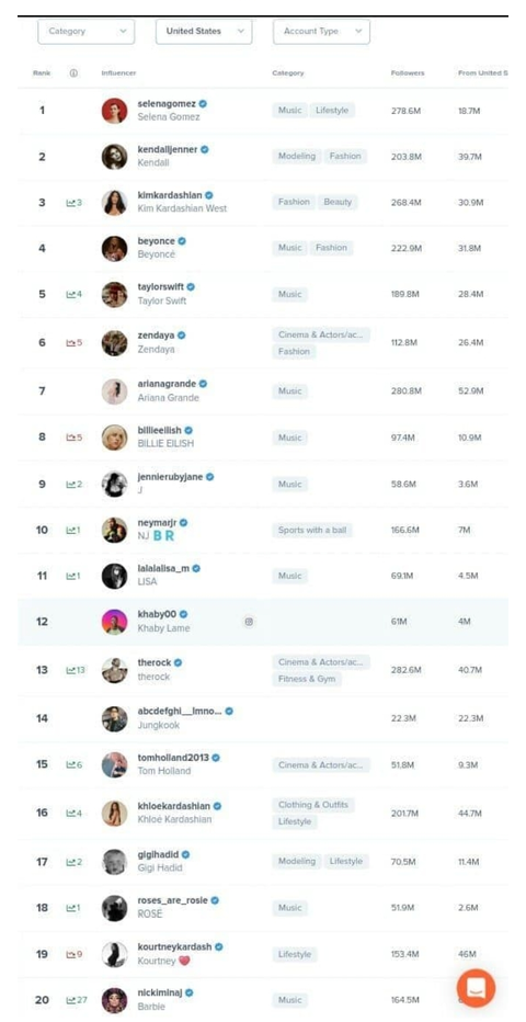 제니 네이마르 리사 순으로 미국인 필로워 3.6M 7M 4.5M인데 순위가 왜 저럼??