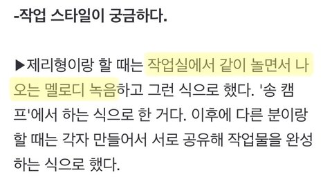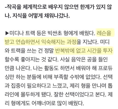 바쁜 와중에도 항상 음악에 대한 열정을 갖고 성장하려고 노력해왔다는 게 너무 대단하고 멋있어서 가져와봤어! 지금은 그런 노력만큼 명곡들 많이 만들어내고 있다는 점도 박수 받을만 한 것 같당