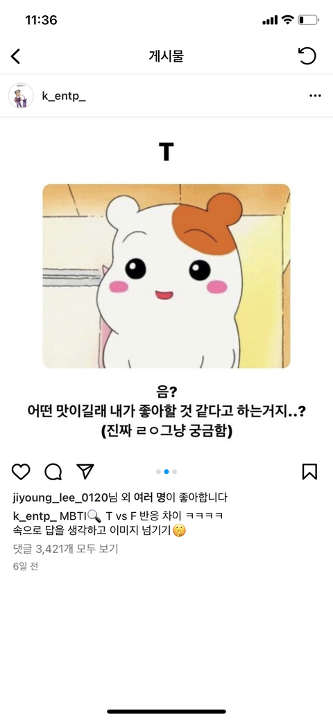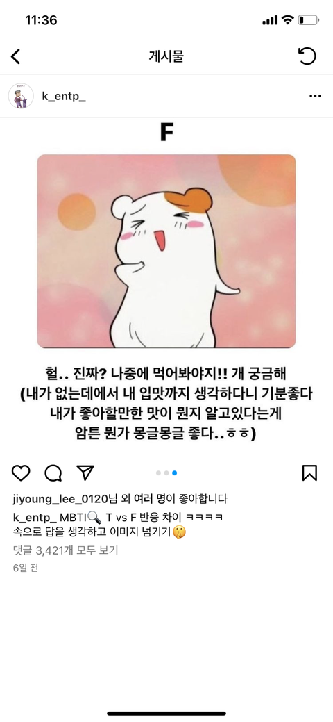 아니 나 f t 거의 반반인데 어쨋든..f거든?? 근데 ㅈㄴ 걍 무슨맛인데?? 이 생각밖에 안들앗는데.... 댓글보면 다 맞댘ㅋㅋㅋㅋㅋ