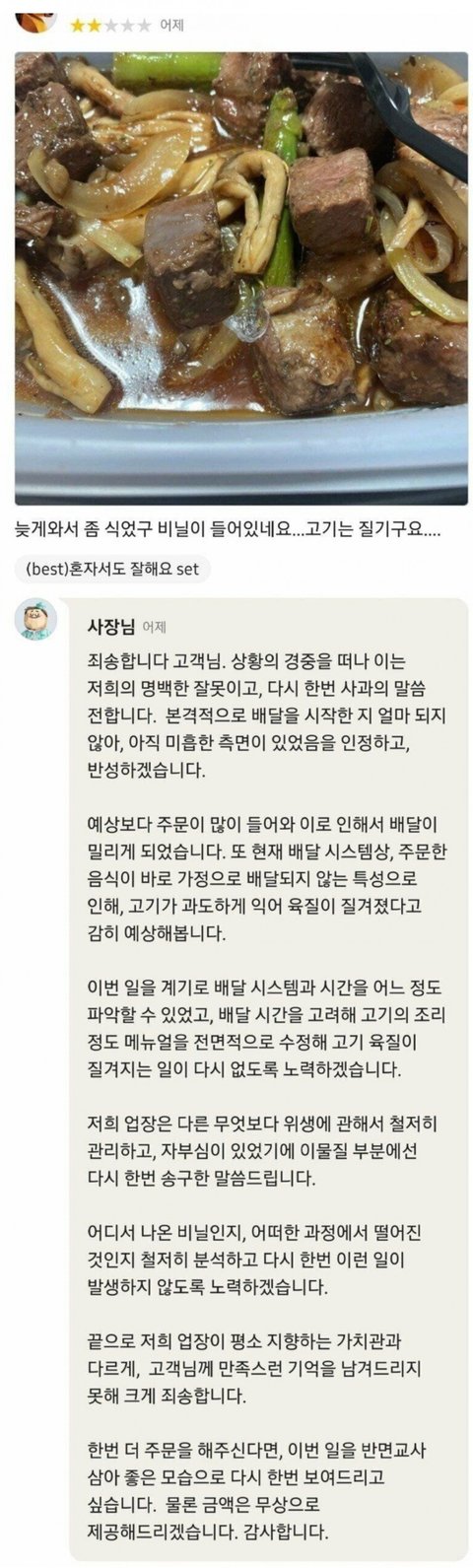 비닐 들어간건 사과해야하는건 맞는데, 이렇게까지 해야 만족해야한다는게 어이가없기도 하다. 요즘 사람들은 실수가 있으면 어디서 어떻게 잘못되었는지 정확하게 인지 후 반성하는 모습을 보고싶어하고, 실수가 나지않게 방향성을 제시함과 동시에 보상까지 해줘야된다는거지. 이렇게 젊꼰대들이 생기는거라고 생각함 ㅡ.ㅡ