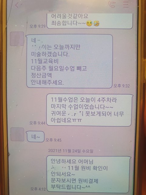 거절 문자를 보내니 답장이 다음주부터 딸 미술 수업