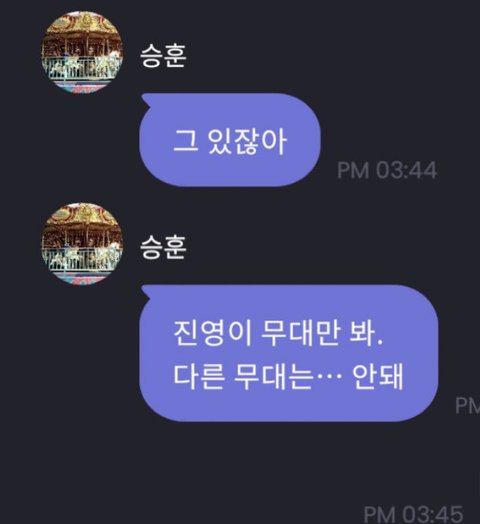 이 버블 어디서 주웠더라 짹이었나? 암튼 워너원 파생 그룹 중에 cix라고 있는데 배진영 있는 그룹이거든? 근데 얘네는 이번에 마마 안 나왔단 말이야 근데 여기 그룹 멤버 중에 승훈이라는 애가 팬들한테 배진영 무대(워너원 합동 무대)만 보고 다른 가수 무대 보지 말라고 하는 거 ㅋㅋㅋㅋ 귀엽네 얘네 무대도 잘하던데 내년에는 마마에서 무대 했으면