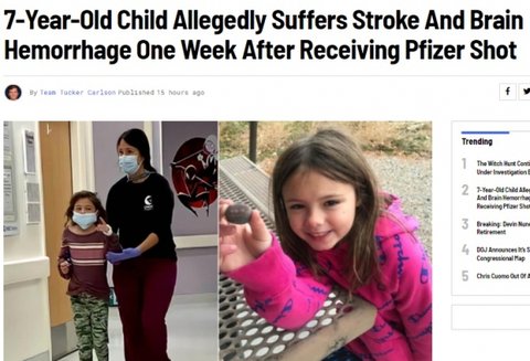 미국 FOX뉴스의 유명 진행자인 터커 칼슨의 이름을 딴 '팀 터커 칼슨' 사이트에 올라온 제보에 따르면, 7세 어린이가 화이자 COVID-19 백신을 접종한 지 일주일 만에 뇌졸중과 뇌출혈을 겪고 있다는 것이다.