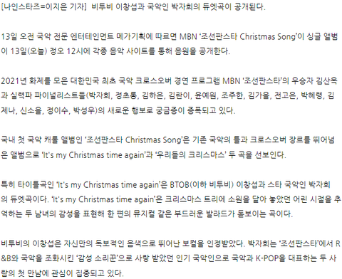 2. 듀엣곡에 대한 기사도 아직 거의 안 올라온 거 보면 메ㄱㅏ기획에서 크리스마스 서프라이즈 음원으로 깜짝 발매하려고 비밀로 했던 걸 수도 있을 것 같대