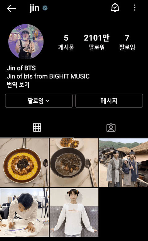 죄홉의 인서타 피드를 본 방탄소년단의 맏형 진