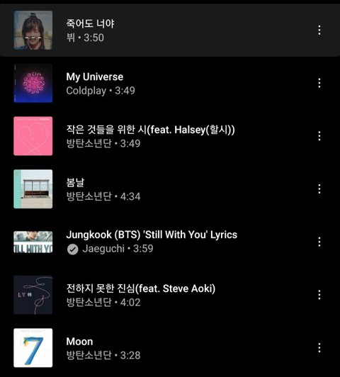 나 작은시 죽어도너야 봄날 still with you 전하지못한진심 ㄹㅇ개좋아함 사실 나 빅히트귀야 노래추천좀.......저 플리는 내가 죽기전에 들어야할 노래 모아둔거임