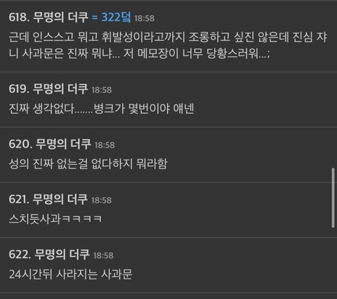 메모장사과 24시간제한반성사과 휘발성사과 미쳤냐고 ㅋㅋㅋ