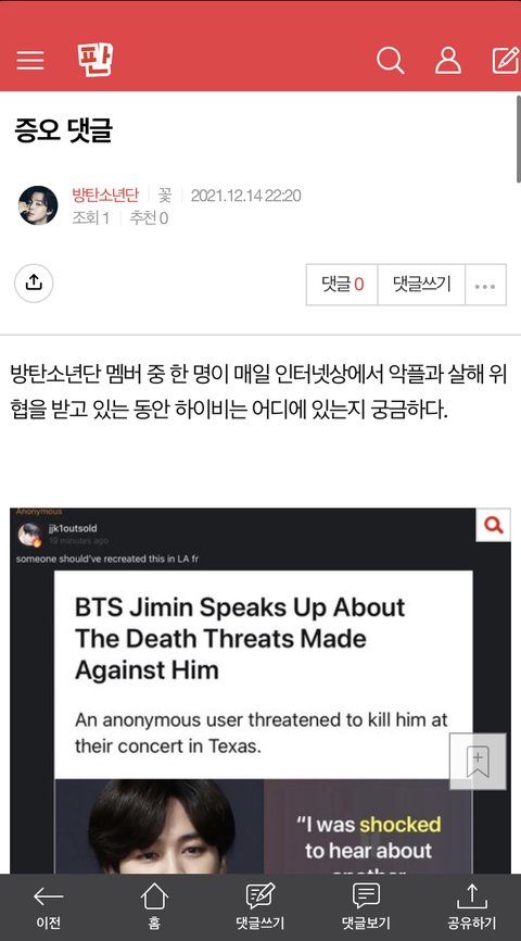 인증 댓에 그냥 저러고 밑에도 영어 적힌 사진만 나열되어있어 ㅇㄱㄹ 많고 관음 많은 팬톡에 올릴 내용은 아니라고 생각해 ❌이 글(조방글)은 추천 누르지마❌