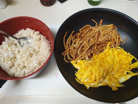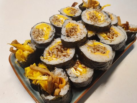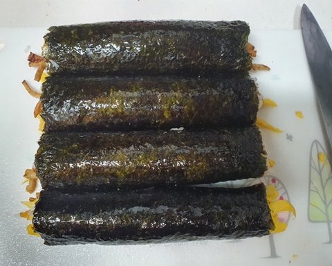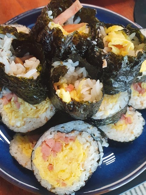 김밥이 먹고 싶은데 재료를 사면 10줄씩 싸야하니 적은량으로 쌀수있는 계란김밥을 해먹습니다. 햇반 3개에 약 4줄 나옴... 단점은 단무지가 없어서 느끼하다는거지요ㅋㅋㅋ