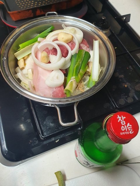 이맘때는 김장수육을 빼먹을수없지요, 소주 3분의 1병 붓고 무수분으로 삶아줍니다.
