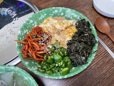 비빔밥에 각종 야채와 청양고추를 조금 썰어 넣으면