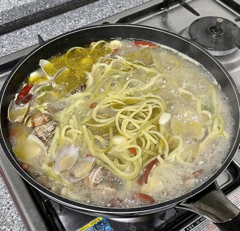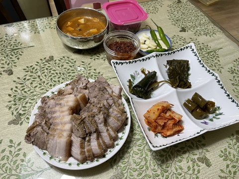 항정살수육, 바지락술찜파스타, 고추장찌개.