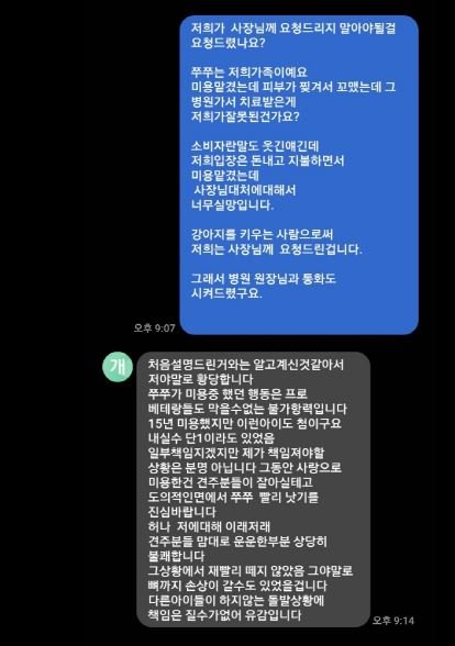 반려견 주인인 저는 상처가 어떠한지 확인해보려고 미용샵 원장과 통화후 병원으로 대려갔습니다.