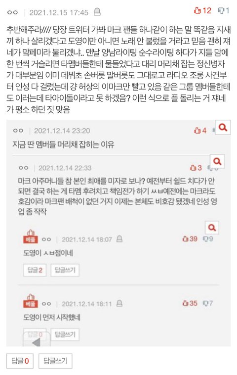 지금 저 실베1위글에선 갑분 재현 태용 악개싸움인척 도배하는데 저것도 마크팬임 덕분에 마크는 1도 안까임