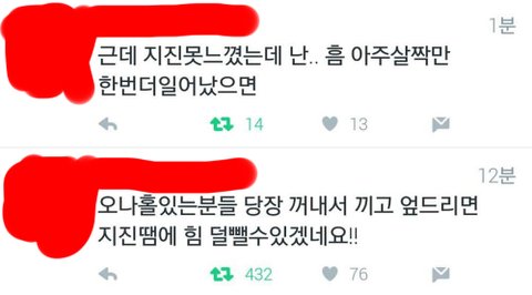 - 그러다 경주지진이 터진거임.채팅창에는 경주에 지진났다, 라는 식으로 단순 걱정+상황공유하는 일반 팬들도 있었지만, "지진이 났는데 이X은 별창짓이나 한다", "돈독 올랐다" 는 식으로 어그로를 또 놓음원래도 어그로들이 있었지만 항상 채팅창 매니저들이 제재를 했음.