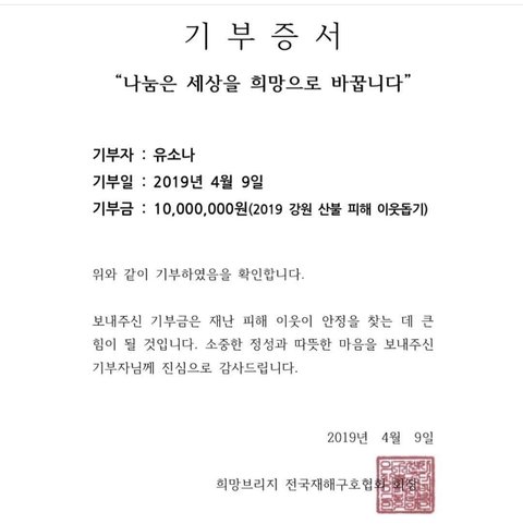2019년에는 강원 산불 피해에 천 만원을 기부했음.