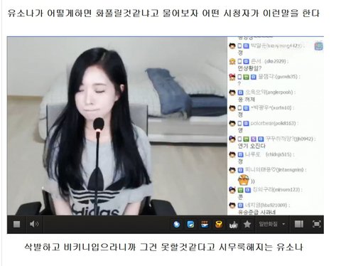 - 아프리카tv는 특히 여캠팬덤간의 경쟁과 이간질이 심한데, 위와 같이 메이저인 유소나는 꾸준히 타bj 팬들이 견제대상이라 여겨 채팅방 내에 어그로를 끌며 어떻게든 한번 건수를 잡아보려고 혈안이였음.