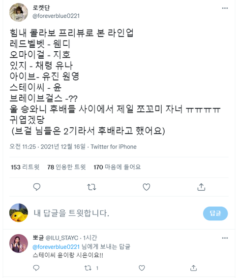 아이브랑 스테이씨도 싸움나겠네ㅋㅋ 안그래도 둘다 중소에 같은인원수 비슷한초동으로 라이벌구도 잡혀가던데ㅋㅋ