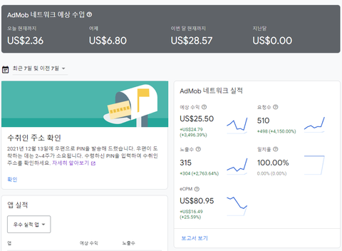 처음에 애드몹 광고를 붙인건 일주일 전입니다.