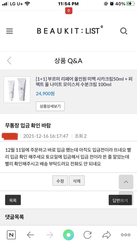 아니 그게 아니고 내가 정확히 12월 11일에 뷰킷리스트에서 크림을 사고 바로 무통장 입금 했는데 17일인 아직도 입금 전이라 떠 ㅠㅠㅠ어떡하지 상담 가능 시간에 고객센터에 전화도 해봤는데 전화기가 꺼져있다고ㅠㅠㅠ아 죽고싶다 ㅠㅠㅠ이거 신고 못해? 그래서 뷰킷리스트 큐앤에이에도 내가 글 올렸는데 보지도 않음 ㅠㅠㅠ 죽어 ㅠㅠㅠ어떡하지 ㅠㅠ 내 돈 내놔 ㅠㅠㅠㅠ근데 큐앤에이 보니까 이런 적이 한 두번이 아니더라….. 다들 이런 내용으로 게시물 올림 ㅠㅠㅠㅠㅠㅠ 잘 알아보고 살 걸 ㅠㅠ 이런 경우 어떻게 해..? 신고 못하나????ㅠㅠㅠ 도와줘 ㅠㅠㅠ