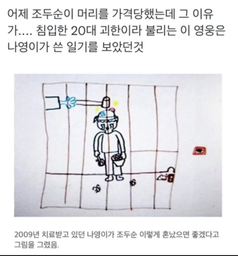 나영이가 치료 중에 조두순이 이렇게 혼났으면 좋겠다고 쓴 그림 보고 한거래