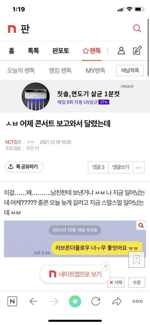 아까 끝나고 만났는데 남친이 많이 마셨냐고.. 대체 그게 뭔데 그렇게 좋았냐고… 나한테 보낼만큼 좋았는거면 뭔지 보여주든가 이러는거야 그래서 내가 진짜 식은땀이 막 날거같은데 아놔진짜 걍 횡설수설하다가 걍 콘서트에서 한 노래라고 케찹발언하고 자기 보는것보다 콘서트가는게 더 좋냐길래 아니라고 하고 계속 같이 있다가 집에 온지 이제 30분 됐어..