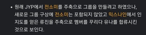 원래 있지멤버는 유나대신 전소미였으나 전소미 제왑나가고 유나가 들어옴