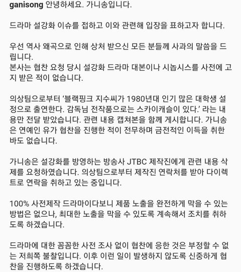 드라마 설강화 이슈를 접하고 이와 관련해 입장을 표하고자 합니다.