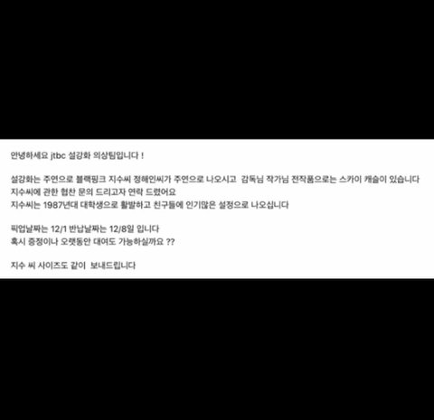의상팀으로부터 '블랙핑크 지수씨가 1980년대 인기 많은 대학생 설정으로 출연한다. 감독님 전작품으로는 스카이캐슬이 있다.' 라는 내용만 전달 받았습니다. 관련 내용 캡쳐본을 함께 게시합니다.