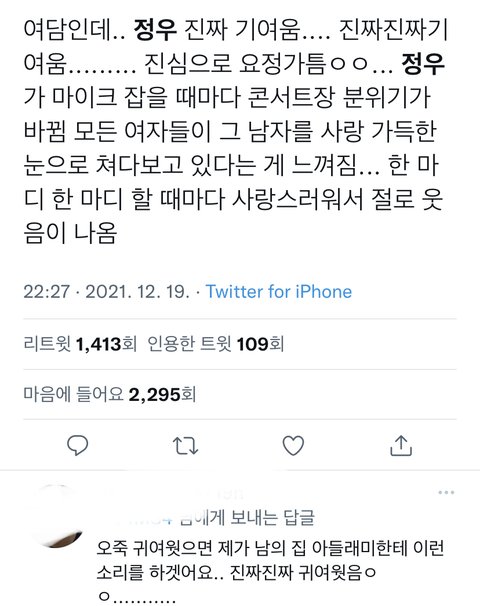 ㅌㅇㄴ팬인 즈니가 올린건데 찐으로 나도 최애가 졍우 아닌데 얘 말할때마다 우쭈쭈해주게 되더라