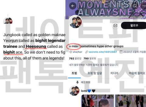 서치하다보니 그 쪽 해외 팬덤이 희승이를 ㅂㅎㅌ 에이스라고 하는 트윗이 조금 있었는데 이 부분까지 관여하기엔 무리가 있어서 쪽지를 보내진 않았어