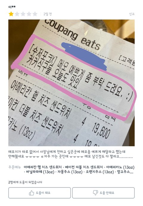 어우 대체 음식주문하는데 저런거 왜 요구하는것이며 안해줬다고 별1점..