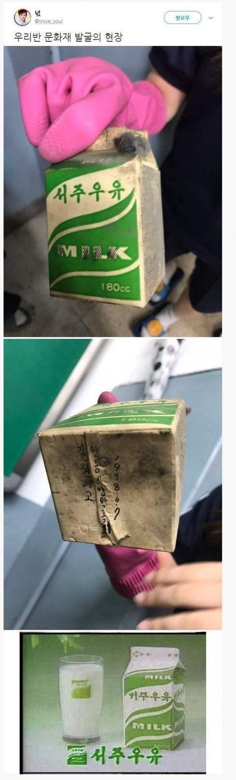 안터진걸로 봐서 다 먹은 우유팩이 아닐지. 날짜는 1978년이 맞음. 우리나라 원래 7자 ㄱ자 같이 많이 썼는데 ㄱ자와 헷깔릴까봐 꺾인7자로 씀. 외국은 다들 ㄱ모양에 가깝게 7자 쓰고