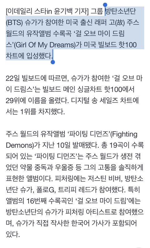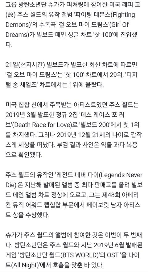 갑자기 그로들 멀쩡한 글에 추천수 조작, 댓도배하며 발작하길래 뭔 일 있나 싶어 찾아봤는데 방탄 슈가가 협업한 곡 빌보드 핫백 29위, 디지털 송 세일차트 1위했다네ㅋㅋㅋㅋㅋ 진짜 사이언스다..암튼 축하축하