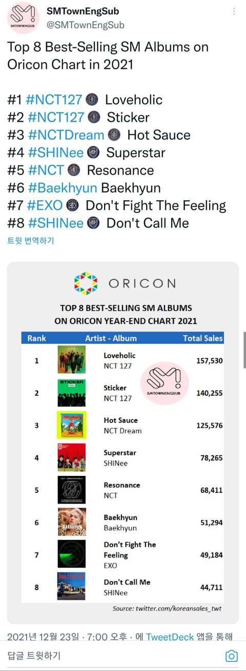 오 우리칠 올해 스엠 오리콘 1위 2위