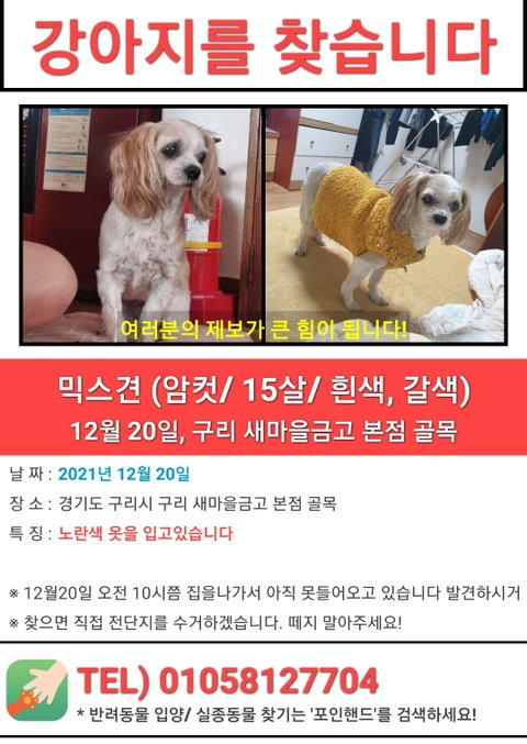 12월20일 구리 켈리포니아 호텔 골목에서 목격제보 후 소식이 없습니다. 사진에 나와있는 지도 쪽에서 혹시 발견하시거나 보호중이신 분은 꼭 연락 부탁드리겠습니다. 현재 노견이고 심장약을 하루에 한번씩 복용해야 하는데 못하고있습니다 부탁드립니다