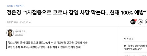 정은경 "1차접종으로 코로나 감염 사망 막는다…현재 100% 예방" | 연합뉴스 (yna.co.kr)